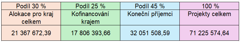 V rámci krajského grantového schématu získal nejvyšší dotaci ve výši téměř 21,4 milionu korun Středočeský kraj. Jak ukazuje následující tabulka, dotační schéma ve výsledku vygeneruje projekty v hodnotě přes 71 milionů korun: