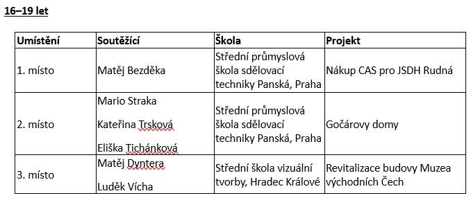 Nejlepší práce v každé kategorii a věkové skupině byly odměněny poukázkami na nákup elektroniky. Týmy na prvních třech místech získaly poukázky v hodnotě 3 000, 2 000 a 1 000 korun, přičemž poukázku obdržel každý člen vítězného týmu. Ministerstvo pro místní rozvoj děkuje všem studentům za účast a kreativní zpracování tématu a gratuluje vítězům.